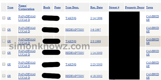 Το παρακάτω screencap είναι από το site της πολιτείας της Μασαχουσέτης και έχει στοιχεία για χρονιές πριν το 1999. Ο όρος “Taking” σημαίνει ότι καταχωρείται ληξιπρόθεσμη οφειλή (αφού έχει περάσει ένα διάστημα) και “Redemption” ότι εξοφλήθηκε. Ο παρακάτω πίνακας δείχνει μια σύνοψη με ημερομηνίες των ληξιπρόθεσμων υπολοίπων για τους λογαριασμούς 1995, 1998, και 1999 (τόκοι και προστίματα συνολικά $354,28 για αυτές τις χρονιές).